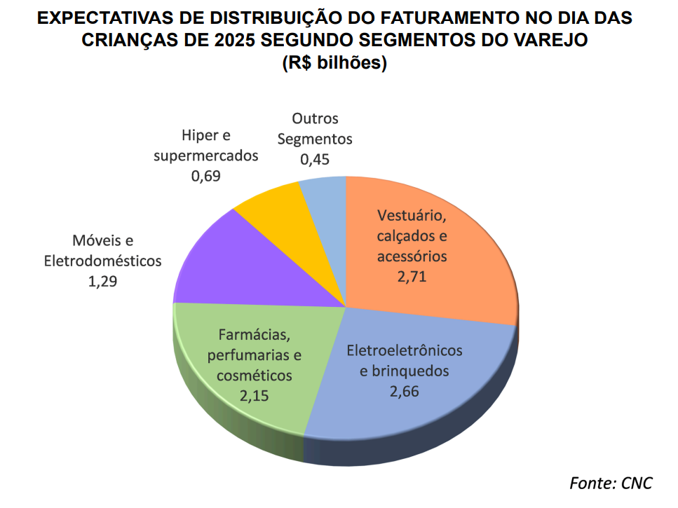 Assim como no ano passado, o segmento de vestuário e calçados deverá ser o destaque da data neste ano, respondendo por 27% (R$ 2,71 bilhões) do volume projetado para as vendas no Dia das Crianças, seguido pelos ramos de eletroeletrônicos e brinquedos (26% ou R$ 2,66 bilhões) e de perfumarias e cosméticos (22% ou R$ 2,15 bilhões).