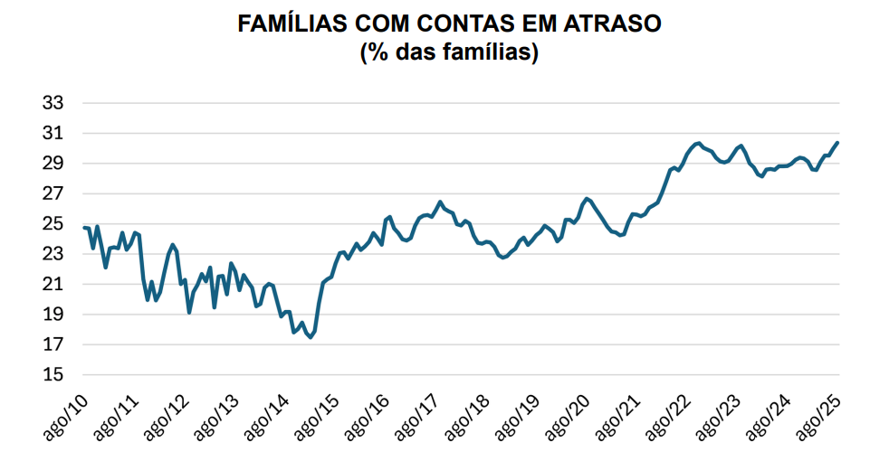 Além de desacelerar a demanda pelo crédito, o maior peso do custo de contratação de empréstimos e financiamentos tem produzido impactos significativos sobre o nível de inadimplência do consumidor. De acordo com a CNC, o percentual de famílias com contas em atraso atingiu o maior
