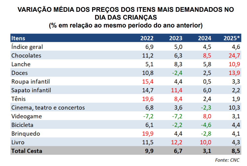 serviços relacionados à data apresente variação de 8,5% em relação ao Dia das Crianças de 2024 – uma aceleração ante os +3,1% registrados no ano passado e a maior variação desse conjunto de bens e serviços desde 2022 (+9,9%).