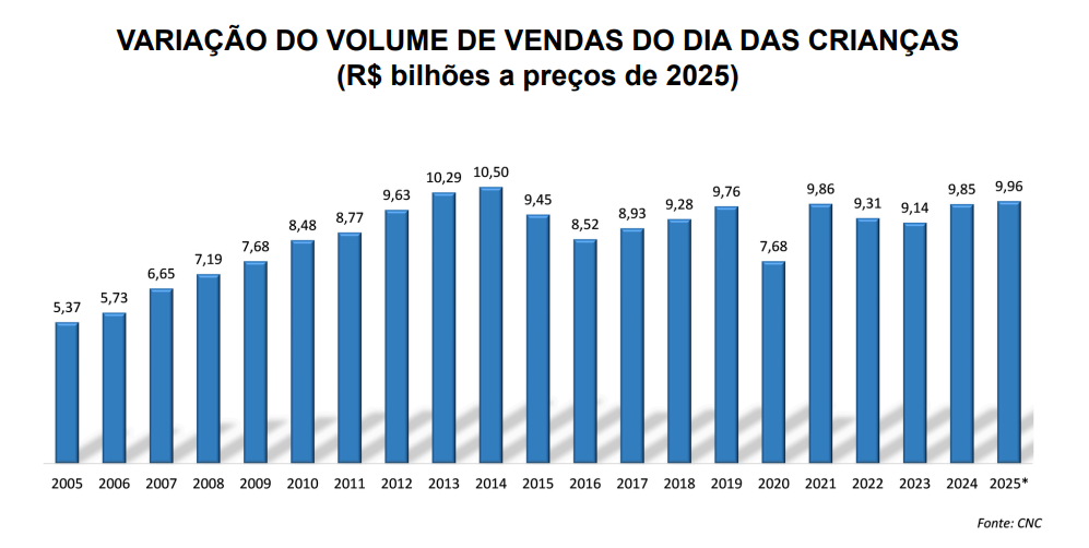 A esperada desaceleração das vendas do varejo ao longo do segundo semestre deste ano deve se confirmar na próxima data comemorativa do setor no Brasil. De acordo com estimativa da Confederação Nacional do Comércio de Bens, Serviços e Turismo (CNC), o volume no Dia das Crianças 2025 deverá registrar a movimentação financeira de R$ 9,96 bilhões. Confirmada essa expectativa, o varejo apresentaria, portanto, um avanço de 1,1% em relação ao ano passado.